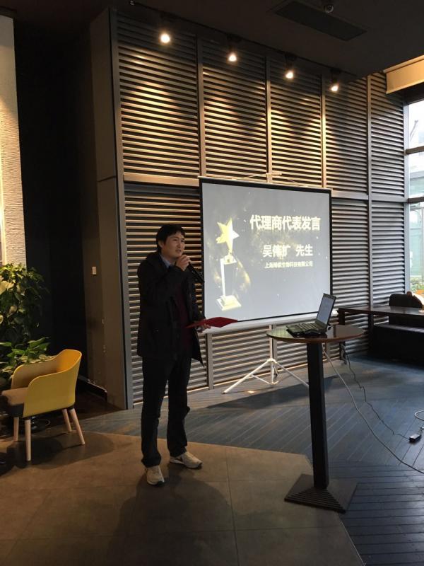頒獎(jiǎng)典禮上榮獲“鉆石營銷獎(jiǎng)”的上海博侯生物的吳偉擴(kuò)總經(jīng)理作為經(jīng)銷商代表發(fā)言, 吳總對海貍給予高度的肯定,并表示2017年一定會在16年的基礎(chǔ)上再接再厲,繼續(xù)做好廠商和終端用戶之間的橋梁。