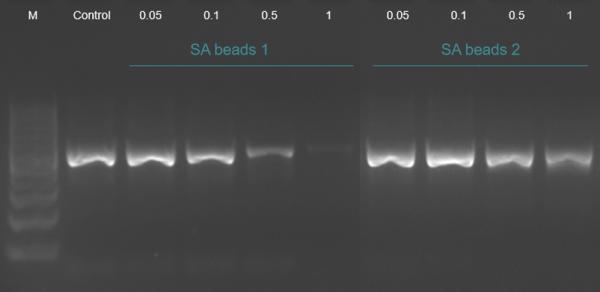 圖2:兩種不同濃度的SA磁珠投入PCR體系中,PCR產(chǎn)物的電泳圖。