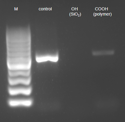 圖4:相同濃度二氧化硅羥基磁珠以及聚合物羧基磁珠(1mg beads/50μL PCR)PCR之后的產(chǎn)物電泳圖。
