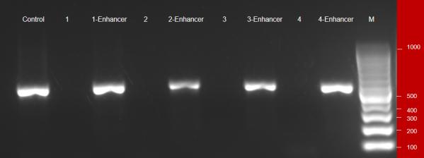 圖6.control為正常PCR產(chǎn)物,1、2、3、4為PCR體系中添加4種不同磁珠的PCR產(chǎn)物。1、2、3、4-Enhancer是在PCR體系中加入以上4中磁珠及4μL的增強(qiáng)試劑后PCR產(chǎn)物。